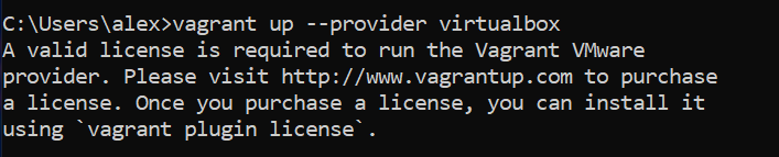 Я погуглил, оказалось, что для использования провайдера vmware необходимо купить лицензию. Это в мои планы не входило, и тогда я попробовал запустить среду принудительно, указав ей бесплатного провайдера VirtualBox.