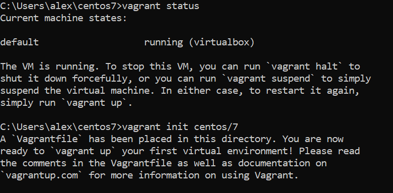 Попробуем развернуть простую виртуальную машину c CentOS 7. Для этого сначала проверим что vagrant работает корректно, а потом запросим VagrantFile