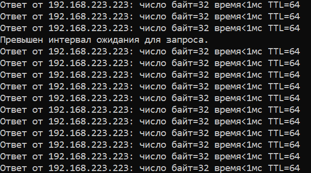 6. Теперь можно проверить работу самого keepalive. Поставим постоянный пинг до адреса 192.168.223.223 и немного подождав выключим node1. Мы увидим небольшой разрыв и далее удачный пинг: